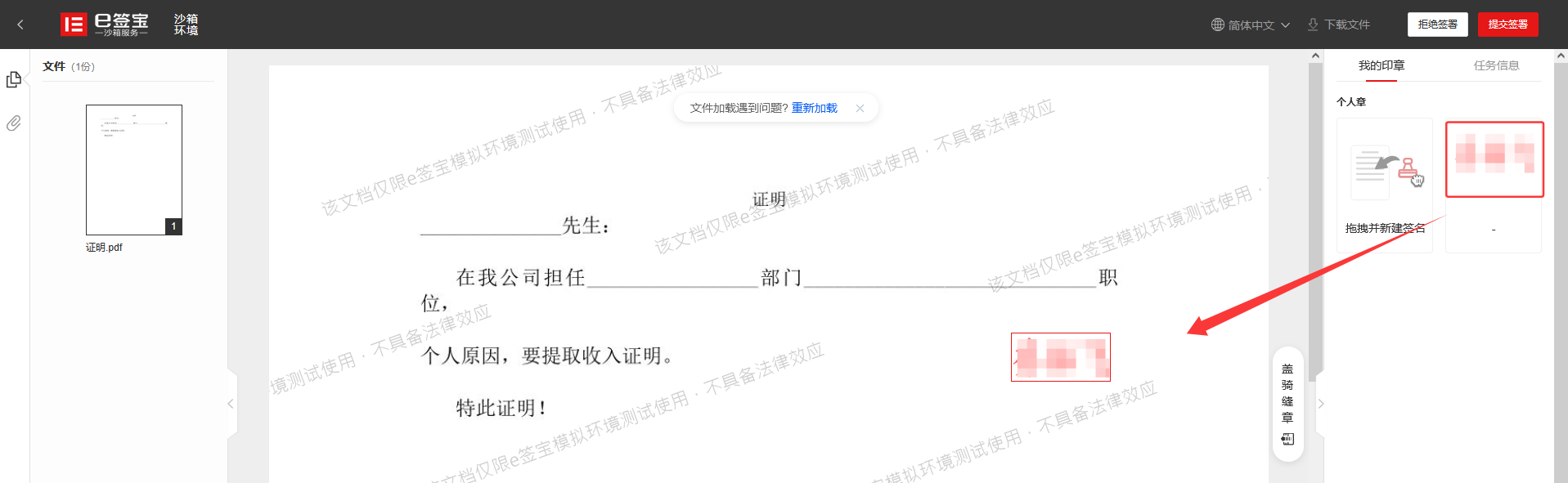 (4)跳转到合同签署页面,将个人印章拖到对应的签章位置,确认无误,点击右上角【提交签署】即可。