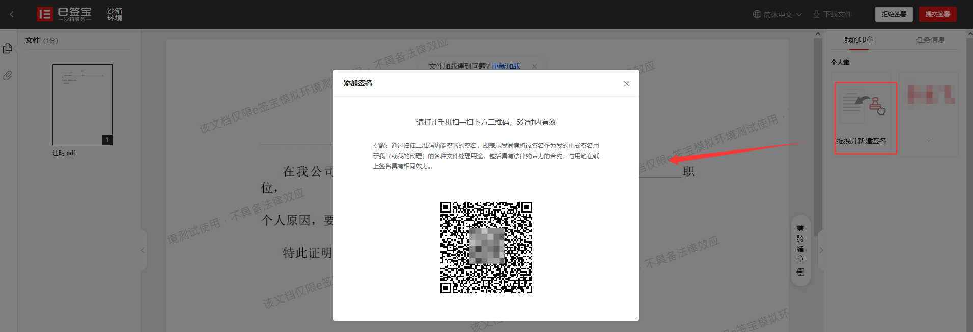 方式二:鼠标点击【拖拽并新建签名】到合同中需要签章的地方,会弹出手绘签名二维码,手机扫码完成手绘签名即可。
