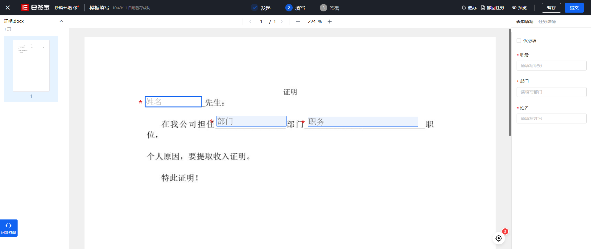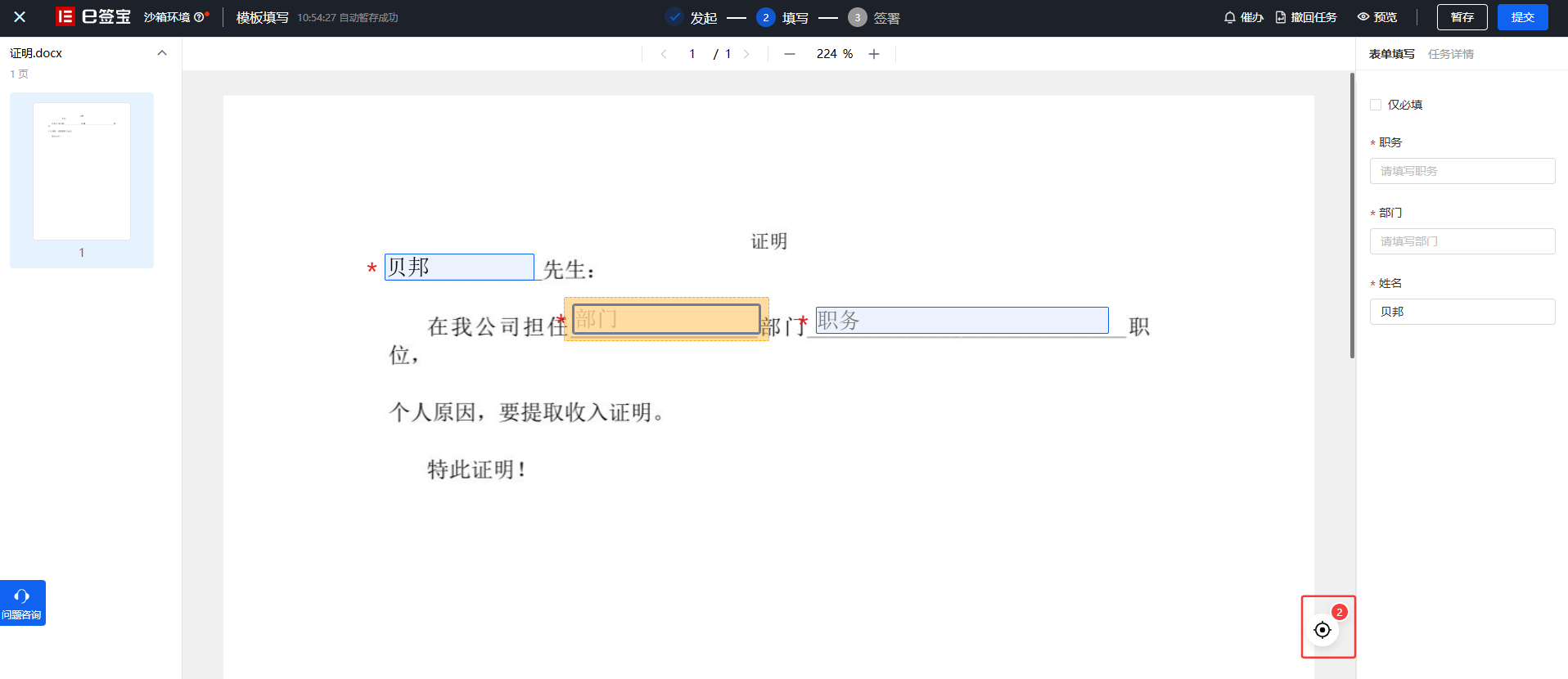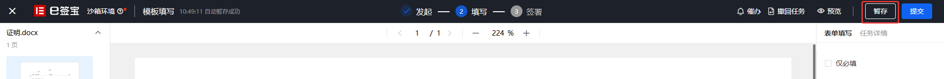 (3)如果合同需要填写,会先跳转到填写页面,将需要填写的控件内容填写好后,点击右上角【提交】即可。