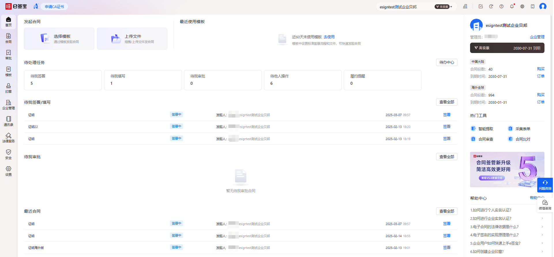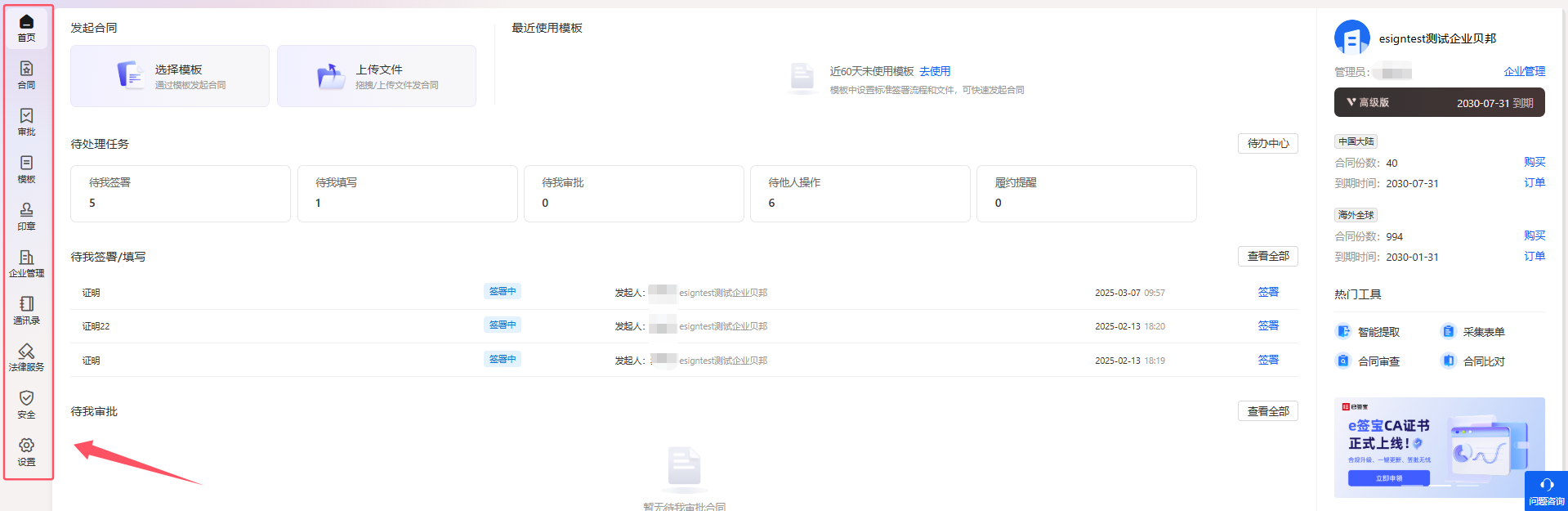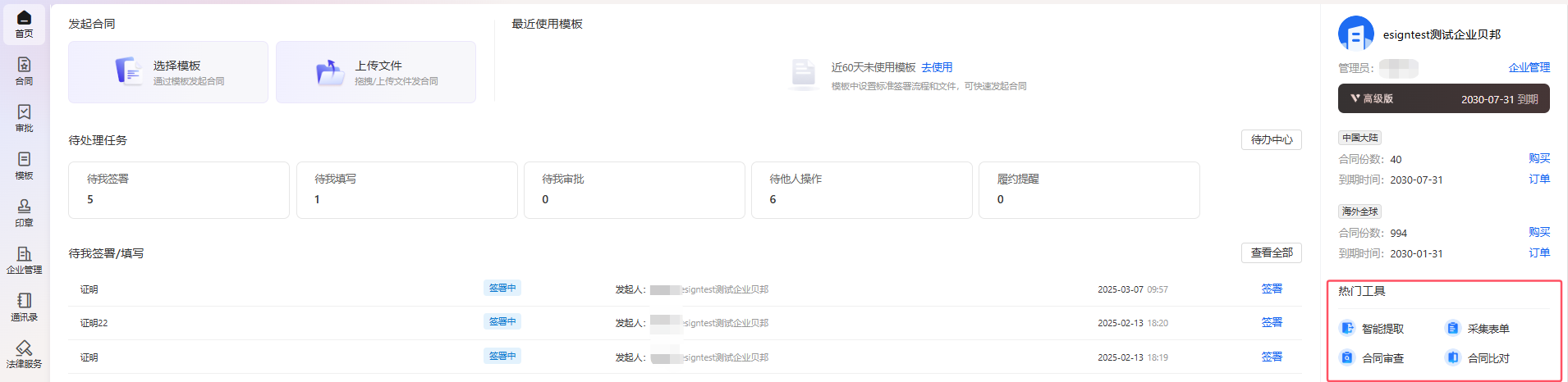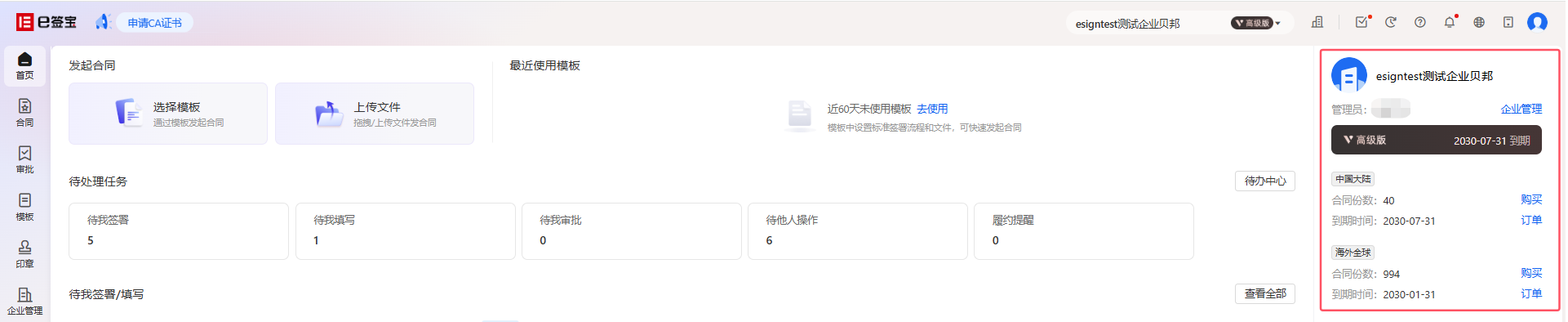 如果是企业空间,会显示当前的企业名称、企业管理员、企业的会员版本及到期时间、企业下的合同份数及套餐到期时间。如果您是企业管理员,可以点击【购买】进入到企业账户套餐购买页面、点击【企业管理】进入企业管理页面。