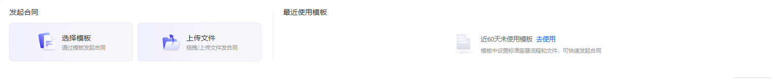 可以点击【选择模板】或【上传文件】发起合同。右侧会显示最近60天使用的模板记录,如果有近期使用模板记录,可以点击模板名称快速进入到模板发起页面。