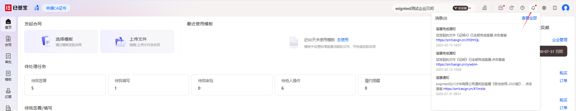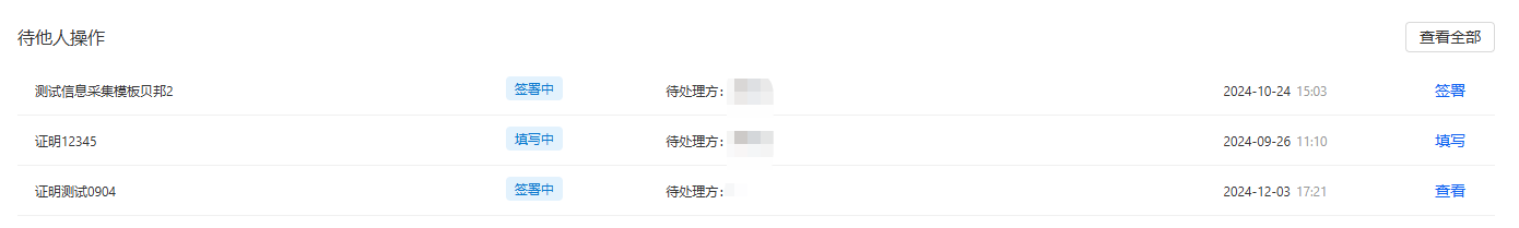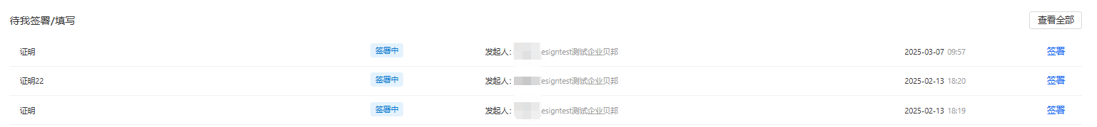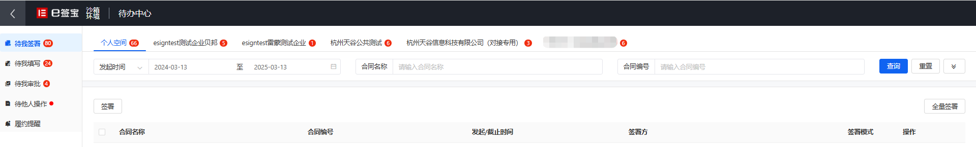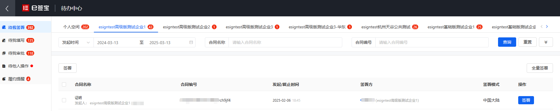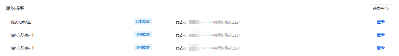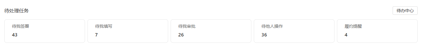 点击【待办中心】跳转到待办中心页面,这里显示自己的所有待办任务,比如待我签署、待我填写、待我审批,对应企业空间下有待办任务时,会有对应的数字提示。