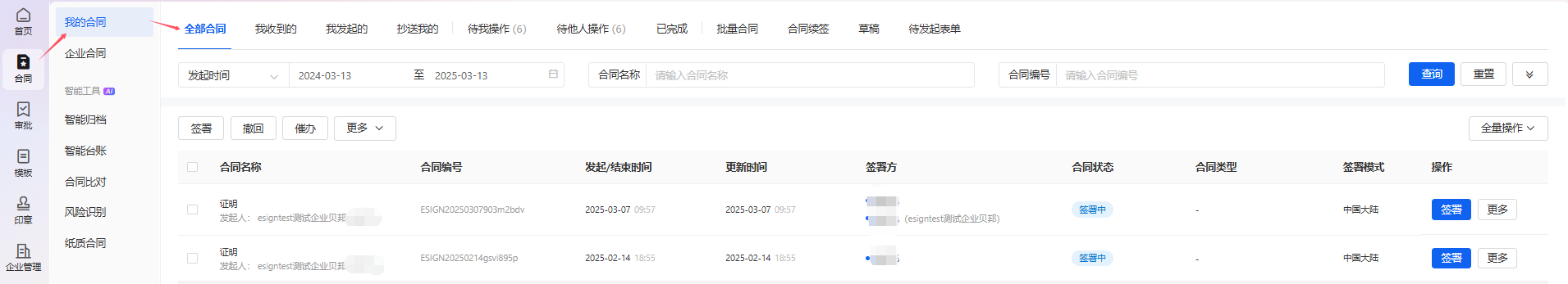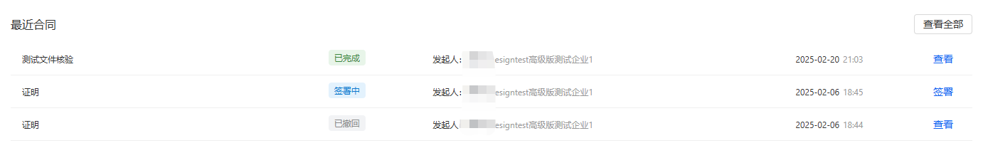 显示自己近期参与的合同,可以点击查看或签署进入到合同详情页。