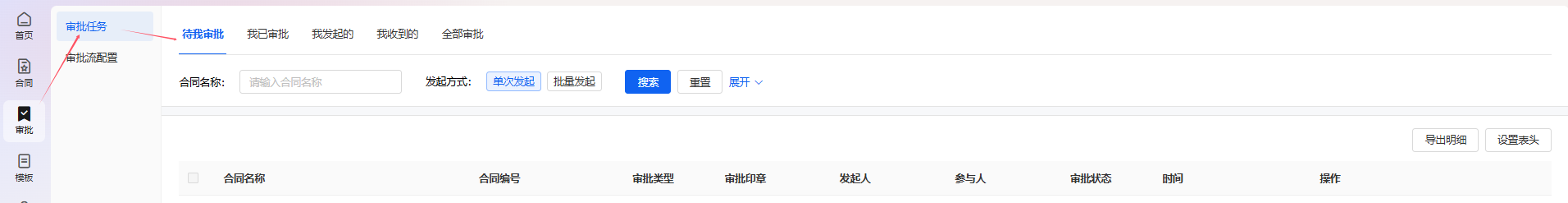 显示待我审批的合同,可以点击【审批】跳转到操作详情页。