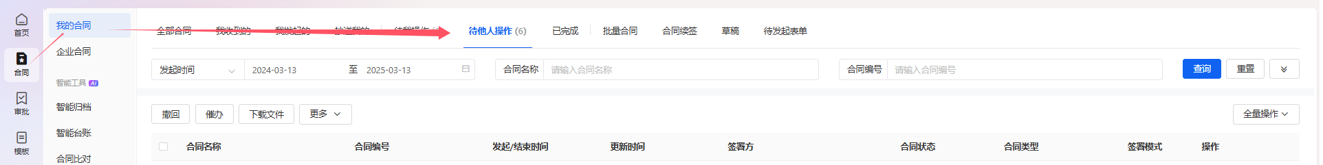 点击【查看全部】会跳转到【合同】-【我的合同】-【待他们操作】页面。