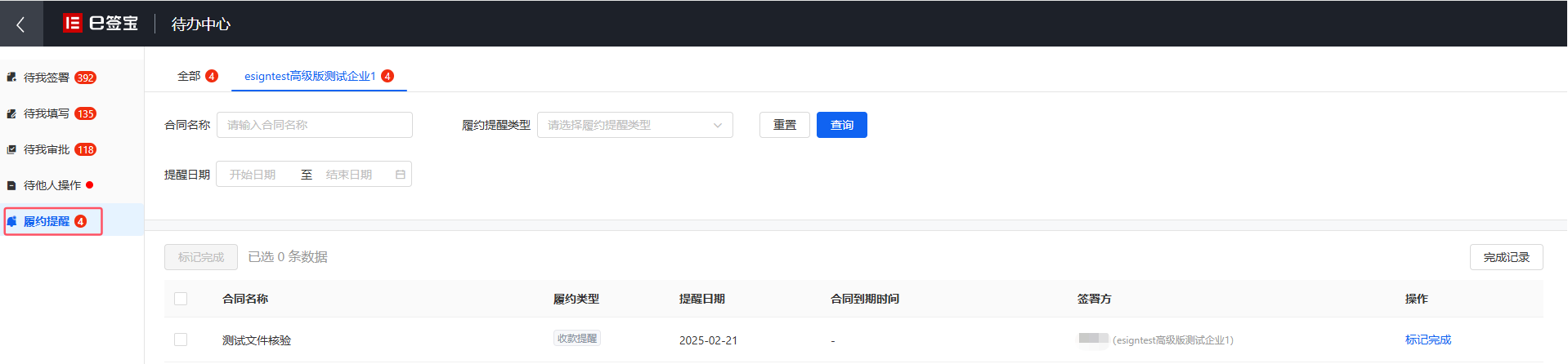 点击【待办中心】会跳转到【待办中心】-【履约提醒】页面。