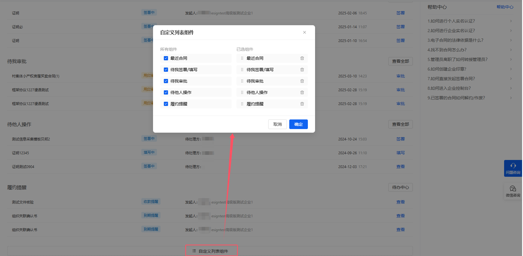 首页可用的快捷列表组件:最近合同、待我签署/填写、待我审批、待他人操作、履约提醒。默认5个都显示,并按照当前顺序排列,用户可自定义表格是否显示、显示顺序。为了保持首页相对完整,至少要求保留1个组件。