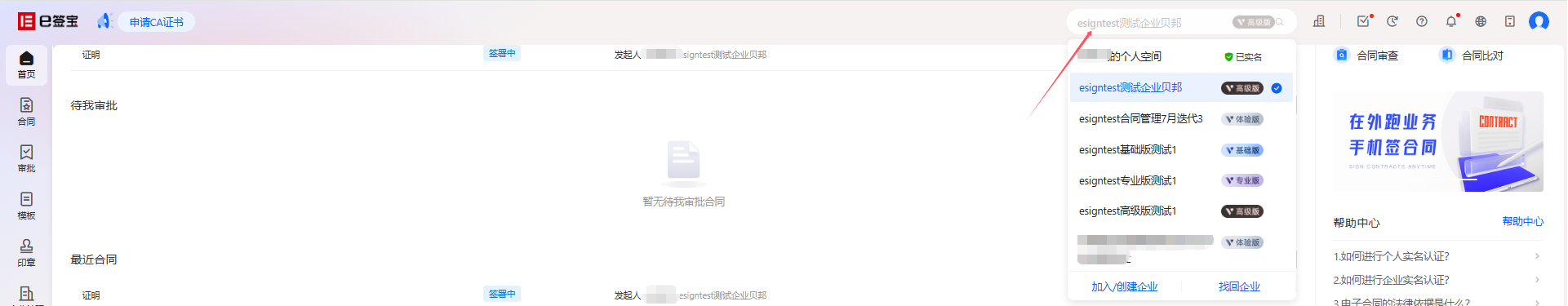 点击这里可以切换企业空间,输入关键字进行企业搜索,下拉列表中会显示企业的会员版本,在最下边可以点击【添加/创建企业】创建新企业。点击【找回企业】可以找回已经在e签宝实名的企业并成为企业管理员。