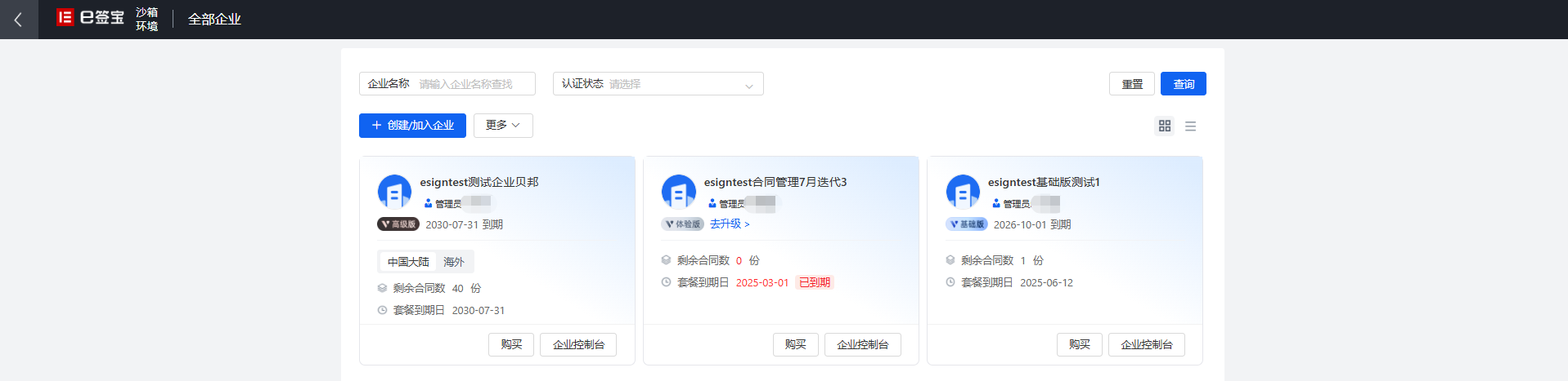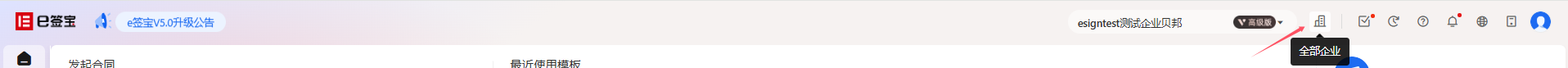 点击【全部企业】跳转到全部企业页面,该页面可以看到自己所在的所有企业,每个企业下边会显示对应的企业管理员名称、会员版本及到期时间、剩余合同份数及套餐到期日。
