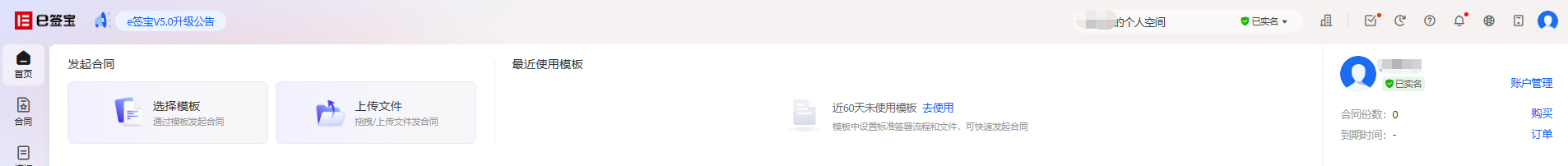 如果是个人空间,会显示当前账号实名名称、合同份数及套餐到期时间。可以点击【购买】进入到个人账户套餐购买页面。